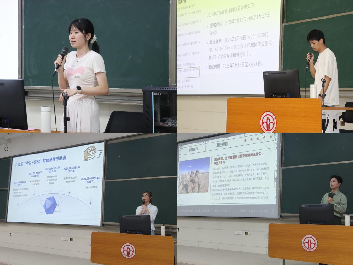 会上,2025届优秀毕业生代表围绕考研、考公、就业及参军入伍等方向展开经验分享,为学弟学妹提供实战指南。来自2021级财政学专业的优秀考研代表李堤分享了考研心得。她建议结合自身能力锚定目标院校,制定“分阶段、可量化”的复习计划,强调“坚持比天赋更重要”。来自2021级金融科技专业的优秀考公代表杨文杰分享了考公笔试“模块化刷题”与面试“心态管理”技巧,指出“考公是一场持久战,需早规划、稳执行”。来自2021级财政学专业的优秀就业代表陈俊言分享了“就业与考公两手准备”的宝贵经验,呼吁打破“信息茧房”,主动关注招聘动态,建议“简历定制化、面试场景化”,并提醒需理性评估双轨备战(就业与考公)的可行性。以及来自2021级金融与投资公司金融学专业陈梓聪(退伍军人)回顾部队历练对意志力与责任感的塑造,分享“退伍考研”的成长路径,鼓励学子以参军经历为人生加分项。