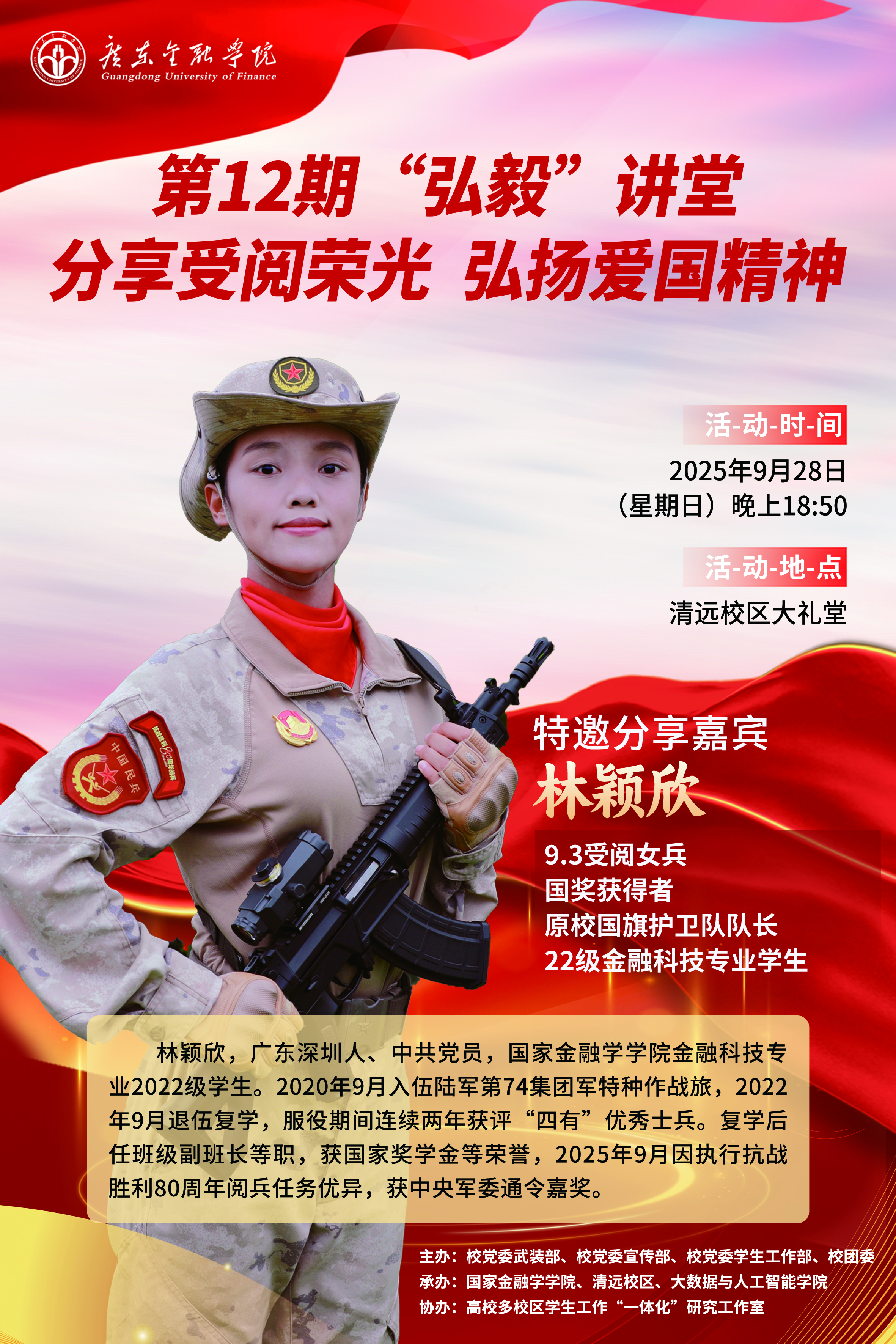 9月28日,在第12期“弘毅”讲堂上,林颖欣为清远校区七百余名师生带来“分享受阅荣光 弘扬爱国精神”专题报告。本次活动由公司党委武装部、公司党委宣传部、公司党委员工工作部、校团委等部门主办,beat365英国官网网站、清远校区承办,高校多校区员工工作“一体化”研究工作室协办。清远市教育局党组成员、副局长伏开放博士,清远校区党工委常务副书记兼大数据与人工智能公司党总支书记何飞,国家金融学公司党总支书记丘志君及辅导员代表黄雪梅、彭妍年、孔智仪、曾昭文、李影媚等出席活动。活动由清远校区党工委副书记兼大数据与人工智能公司党总支副书记缪洁主持。