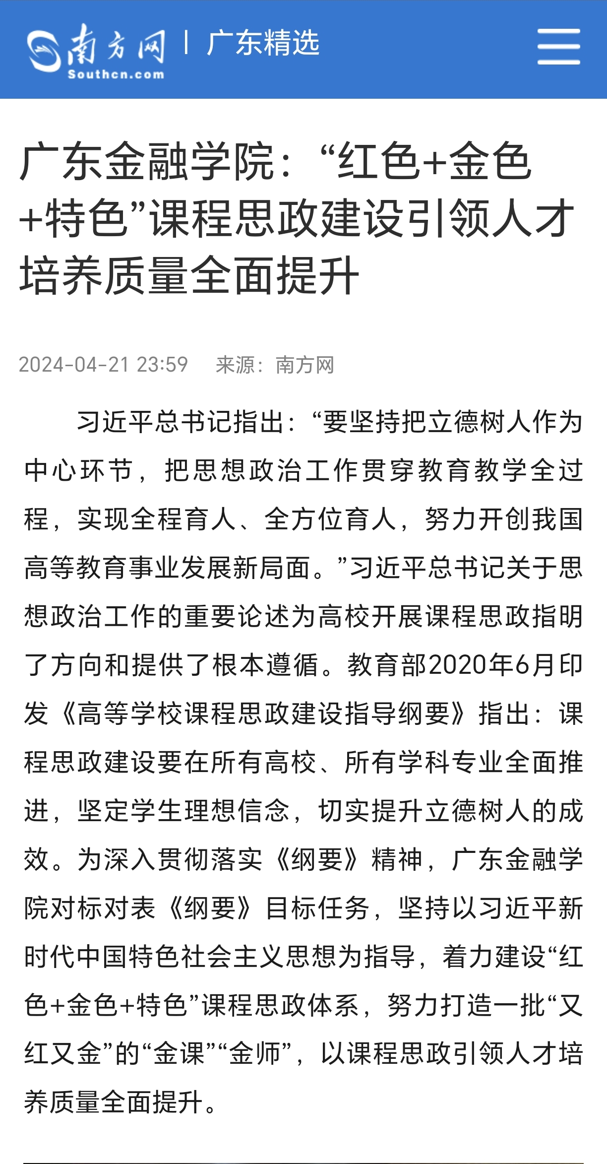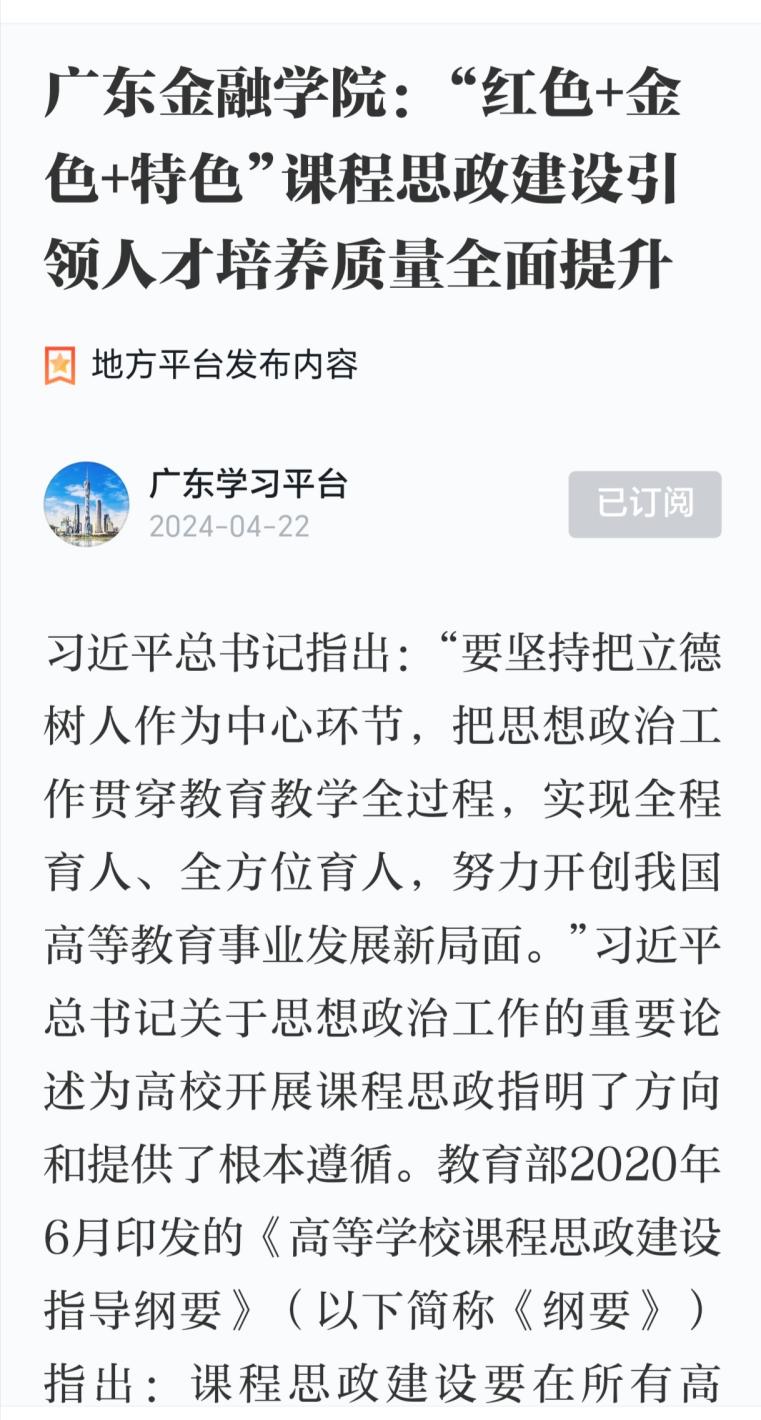 beat365英国官网网站坚持立德树人,深入贯彻《高等公司课程思政建设指导纲要》,发挥红色金融文化等优势,构建了“红色+金色+特色”的课程思政体系,为人才培养工作赋能。beat365英国官网网站课程思政团队在全面、深入、持续调研公司课程思政建设情况的基础上,凝练总结了公司课程思政建设的经验做法,形成了研究成果——《beat365英国官网网站:“红色+金色+特色”课程思政建设引领人才培养质量全面提升》,并先后于2024年4月21日、4月22日、5月6日发表在南方网、“学习强国”广东学习平台及beat365英国官网网站校园网,获得广泛关注与赞誉。其中,在“学习强国”广东学习平台上,阅读量达到216832次,点赞量高达11450次,这一数据反映了该平台内容的受欢迎程度和用户活跃度。