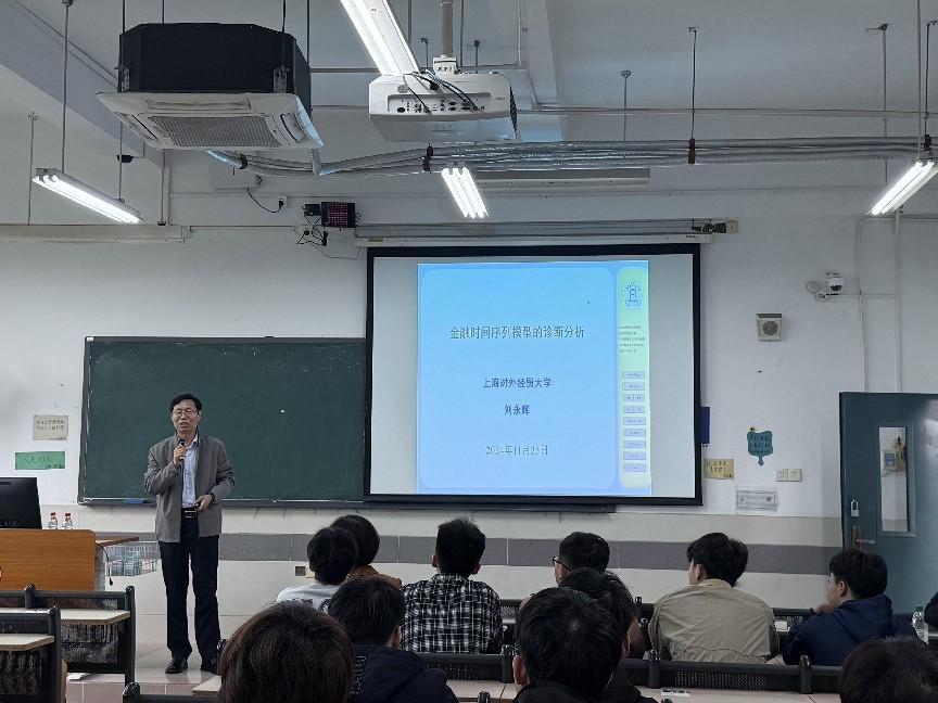 本次讲坛特邀上海对外经贸大学统计与信息公司教授、博士生导师刘永辉教授作题为“金融时间序列模型的诊断分析”的学术报告,旨在深入探讨和交流在数字化和智能化技术快速发展的背景下,金融科技板块模型分析的最新进展。讲座中,刘永辉教授首先介绍了金融时间序列的特征,并详细阐述了诺奖学者在此领域的杰出贡献。随后,他深入讲解了VAR(向量自回归)模型和GARCH(广义自回归条件异方差)模型的基本原理及其应用。接着,他重点分享了贝叶斯向量自回归模型的诊断分析方法,强调了其在实际问题中的重要性。最后,他还回顾了自己在过去十年中所从事的相关工作,展示了他在该领域的研究成果和经验积累。与此同时,刘永辉教授运用风趣幽默的方式,为同学们讲解了金融数据曲线的计算方法与模型创新,为我们建立数字模型提供了新思路。