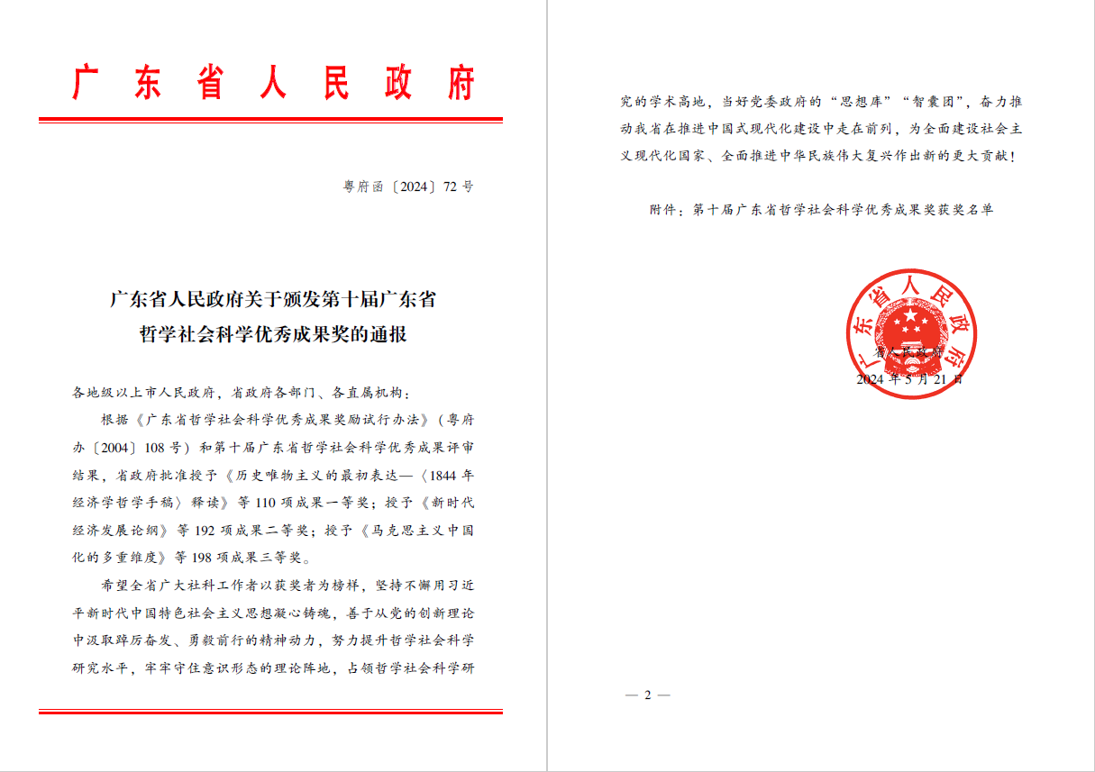2024年5月21日,广东省人民政府正式公布《广东省人民政府关于颁发第十届广东省哲学社会科学优秀成果奖的通报》(粤府函[2024]72号文件)。来自通报名单显示,beat365英国官网网站2项科研成果获得奖励。