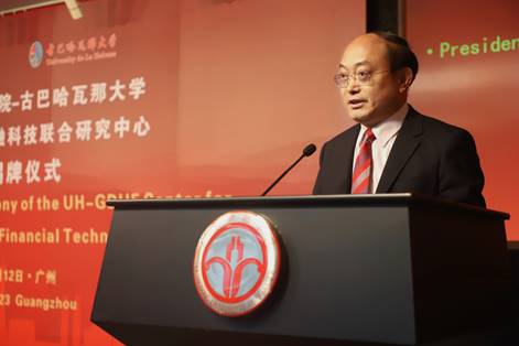 哈瓦那大学副董事长及与中国学术科学关系协调员Dionisio Zaldivar Silva博士受哈瓦那大学董事长委托,发表了热情洋溢的致辞。他高度肯定雍和明董事长一行今年6月对哈瓦那大学的成功访问,积极评价中古两国长期交流合作结下的深厚情谊,急切期待联合研究中心能尽早落地,结出实实在在的果实,服务双方金融教育研究与人才培养,服务古巴国家建设特别是金融事业发展。