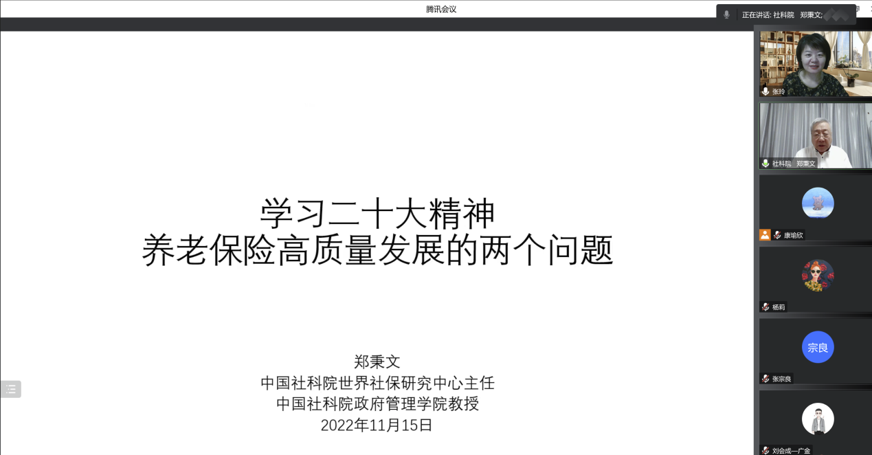 11月15日,全国政协委员、中国社会科公司政府管理公司郑秉文教授做客公司“国家金融学大讲坛 ”第六讲,带来主题为“学习二十大精神,养老保险高质量发展的两个问题”的精彩报告,本场报告吸引三百多名来自全国数十所高校的师生以及金融机构从业人员参加。本次报告会由经济贸易公司张玲教授主持。