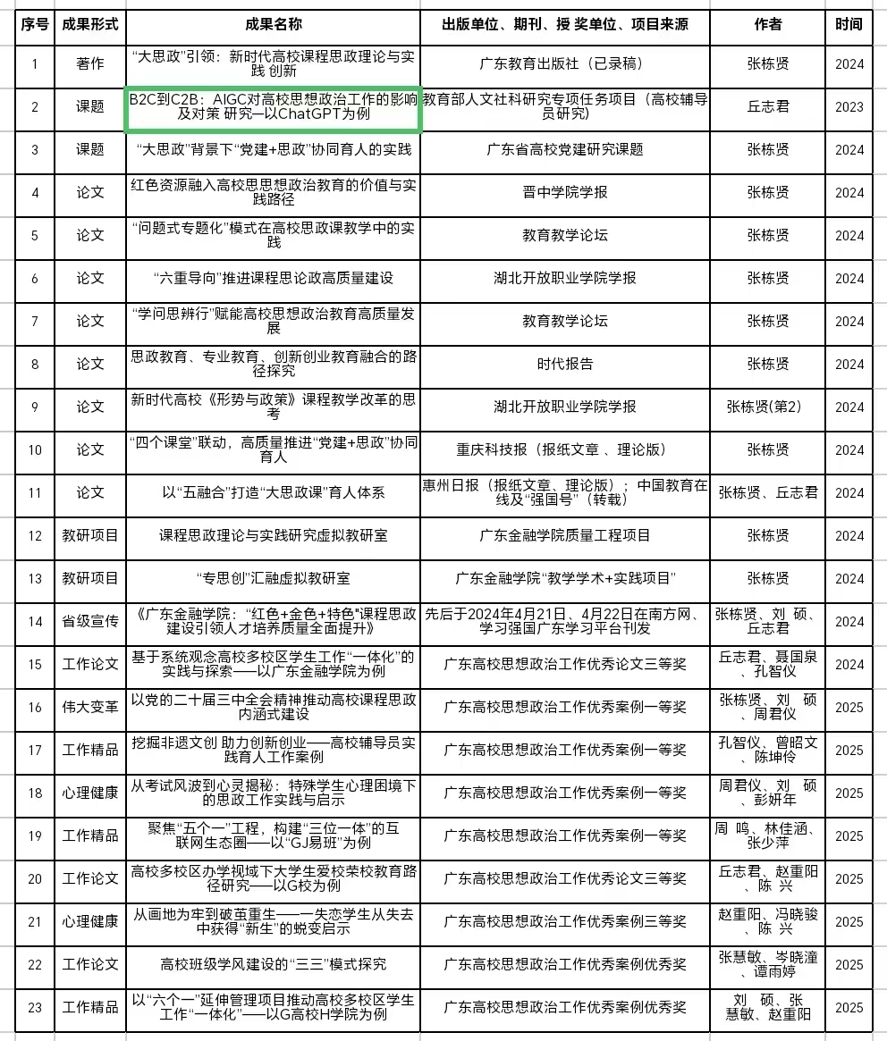 自公司成立以来,公司思政团队目前在研教育部人文社科辅导员专项课题1项,获得省高公司党建研究会课题立项1项,获得校级及以上教研项目立项2项,将出版专著1部,已发表论文8篇,刊发省级宣传报道3篇,以及获得省级奖项9项。