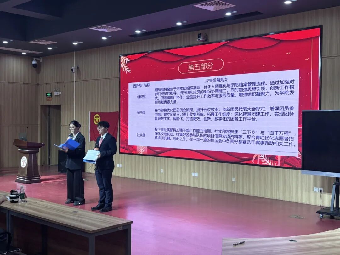 会议第三项议程,团委代表介绍团组织未来的发展规划。院团委下设组织部、秘书部、社会实践部、学术调研部、外联部、网络宣传部六个部门。未来,团组织将持续巩固组织基础,严格依照团章规定,认真履行职责,强化部门间的协作,切实为同学们提供服务,为广大师生办实事。