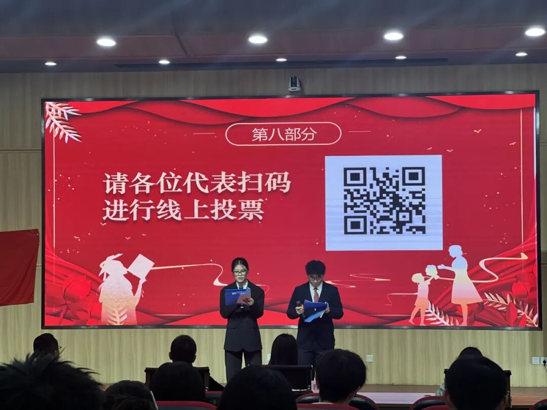 会议第四项议程为投票选举新一届团委委员。主持人将公布候选人名单,并宣读选举规则。此次选举采用现场扫码进行线上投票的方式,秉持公开、公平、公正的原则,最终选举产生新一届委员会委员,并当场宣布投票结果。